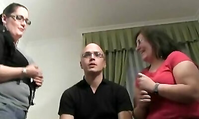 Curvy cougars share this males bbc in a sultry threesome on the couch.