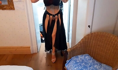 Hot busty Cougar wanks in lace gloves high high-heeled shoes and nylons