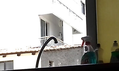 dickflash在一个酒店,其中一个女仆通过阳台,并得到暨在她的奶子