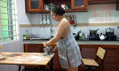 馄饨时间! 裸体烹饪. Regina Noir,裸体主义者酒店度假村的裸体主义者厨师。 光着身子的女仆。 裸体的家庭主妇. 传情人