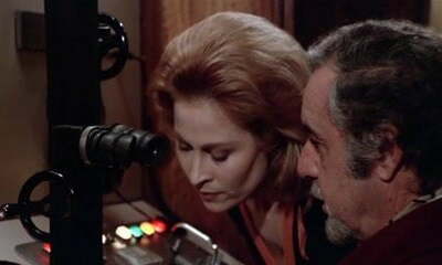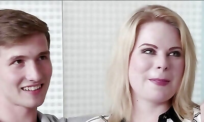 Big-boobed blond super-bitch gets fucked by two guys while her husband watches